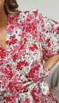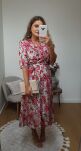 Delikatna, kobieca sukienka uszyta z cienkiej, przewiewnej wiskozy, idealnej na cieplejsze dni. Fason midi z elastyczną gumką w talii pięknie podkreśla sylwetkę i zapewnia wygodę noszenia. Rozszerzane rękawy nadają całości lekkości i subtelnego uroku. To uniwersalna propozycja, która sprawdzi się zarówno na co dzień, jak i na wyjątkowe okazje.