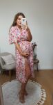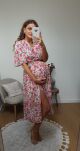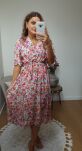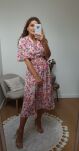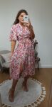 Delikatna, kobieca sukienka uszyta z cienkiej, przewiewnej wiskozy, idealnej na cieplejsze dni. Fason midi z elastyczną gumką w talii pięknie podkreśla sylwetkę i zapewnia wygodę noszenia. Rozszerzane rękawy nadają całości lekkości i subtelnego uroku. To uniwersalna propozycja, która sprawdzi się zarówno na co dzień, jak i na wyjątkowe okazje.
